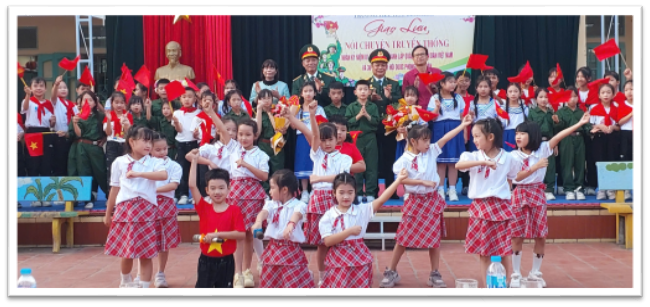 Tiếp nối chương trình là các tiết mục văn nghệ chào mừng do các em học sinh các lớp biểu diễn. Những ca khúc, điệu múa ca ngợi Đảng, Bác Hồ, quê hương đất nước và hình ảnh người lính Cụ Hồ đã tạo nên không khí trang trọng, xúc động và đầy tự hào.