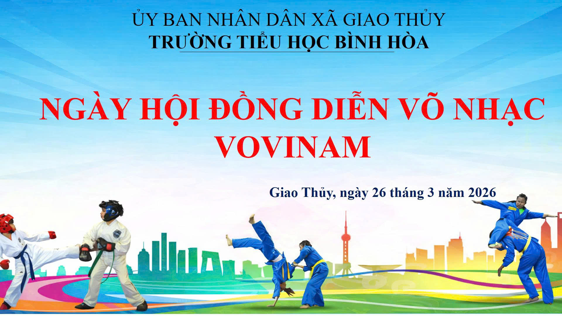 Thực hiện nhiệm vụ năm học 2025- 2026 và Công văn số 784/SGDĐT-CTHSSV ngày 23/03/2026 của Sở Giáo dục và Đào tạo tỉnh Ninh Bình về việc tổ chức Ngày hội Võ nhạc Vovinam học sinh phổ thông trên địa bàn toàn tỉnh. Hôm nay ngày 27/03/2026, trường Tiểu học Bình Hòa đã tổ chức thành công hoạt động đồng diễn võ nhạc Vovinam trong không khí sôi nổi, hào hứng và đầy khí thế.
